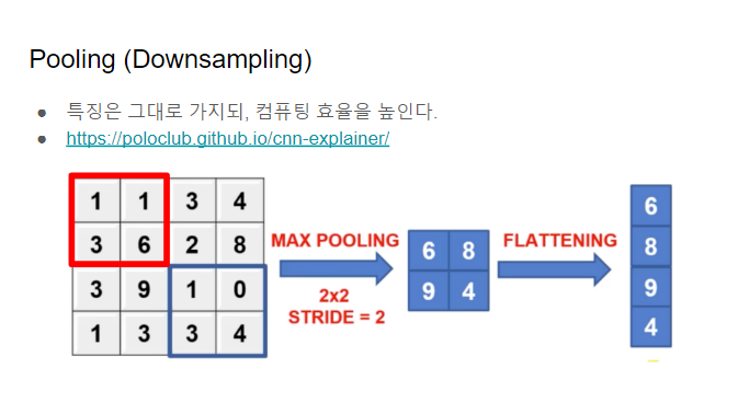 MAX or Average 로 stride만큼 Pooling (Downsampling) 해서 Flattening 하는것 (압축)