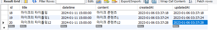 SELECT id, title, datetime, content, createdAt, updatedAt