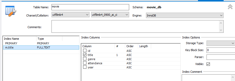 # mysql 워크벤치 테이블 인덱스에 title 컬럼 fulltext 추가해야함
