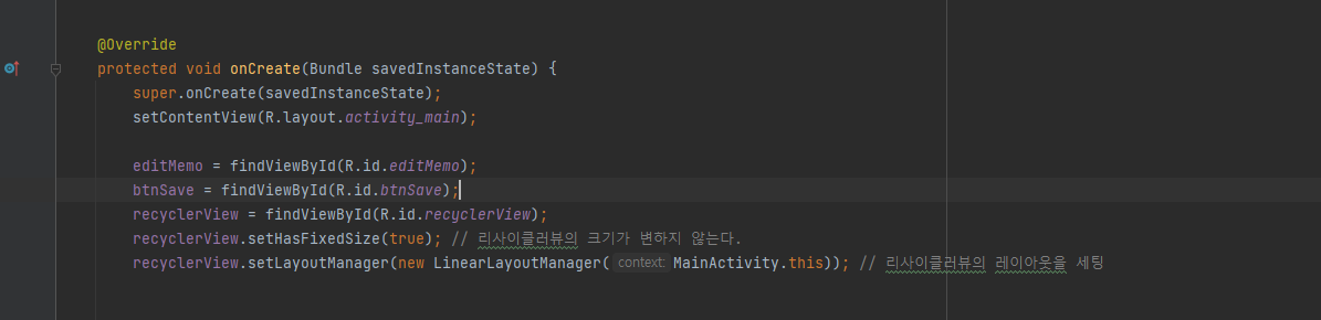 recyclerView.setLayoutManager(new LinearLayoutManager(MainActivity.this)); // 리사이클러뷰의 레이아웃을 세팅