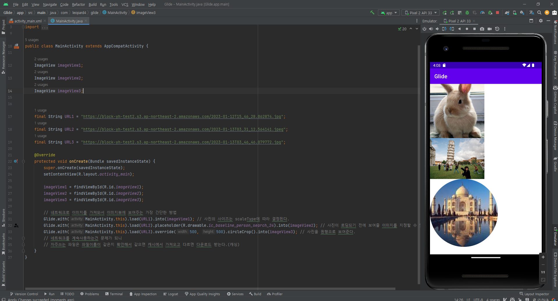 Glide.with(MainActivity.this).load(URL3).override(500, 500).circleCrop().into(imageView3); // 사진을 원형으로 보여준다.