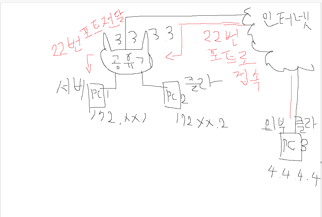 예시 : 외부기기에서 공유기 IP인 3.3.3.3:22로 접속을하면 172.*.*.1:22로 연결됨 (물론 외부에서 접속하는 기기도 private파일을 가지고있어야 하겠다.)
