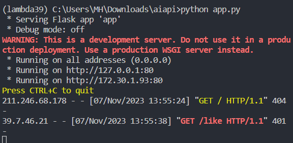 app.run() -> app.run(host='0.0.0.0', port=80) 으로 변경