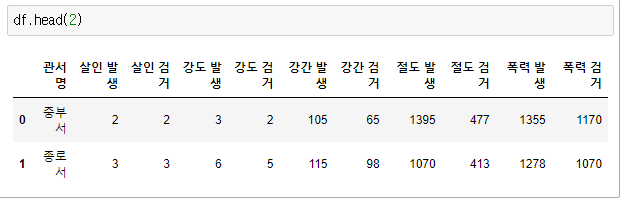 ### 혹은 df["관서명"].str[ : -2+1] 이런식으로 슬라이싱도 가능하다.