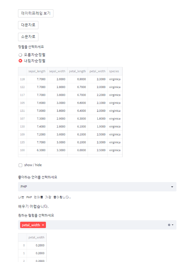 status = st.radio('정렬을 선택하세요', ['오름차순정렬','내림차순정렬'])