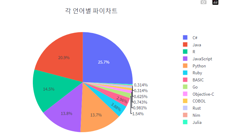 fig6 = px.pie(df4, 'lang','Sum',title='각 언어별 파이차트')