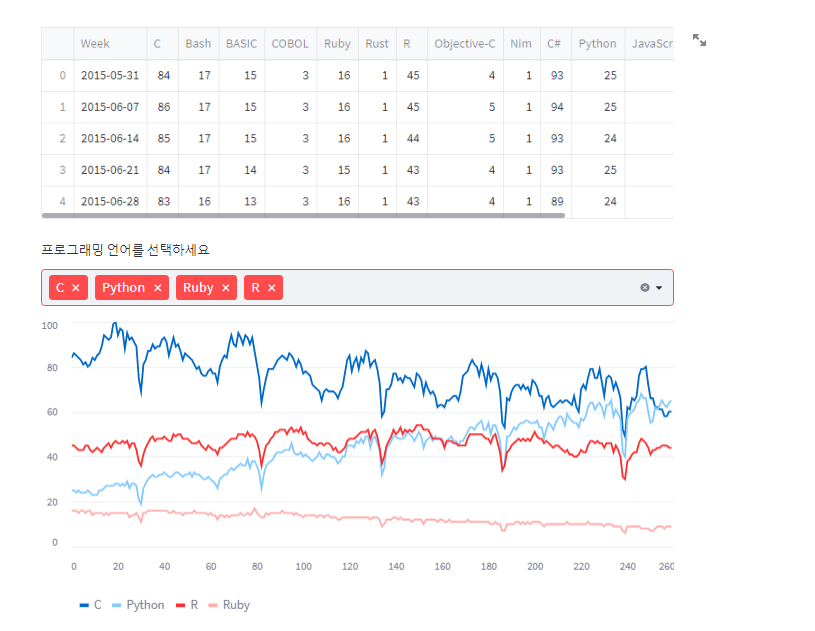 choice_list = st.multiselect('프로그래밍 언어를 선택하세요', column_menu)