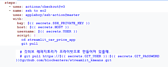 git pull https://${{ secrets.GIT_USER}}:${{ secrets.GIT_PASSWORD }}@'레파지토리주소' 를 추가하면된다
